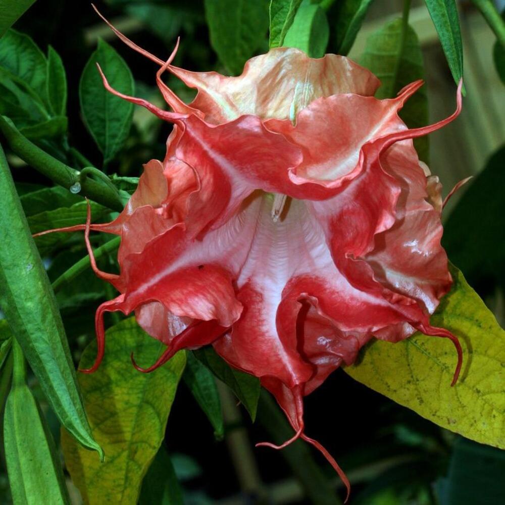 Brugmansia Theas Liebling цветет весной-летом. Цветки многочисленные, крупные, до 30 см в длину, ароматные, свисающие, розового окраса, воронкообразной формы. Сорт используется как садовое и горшечное растение.