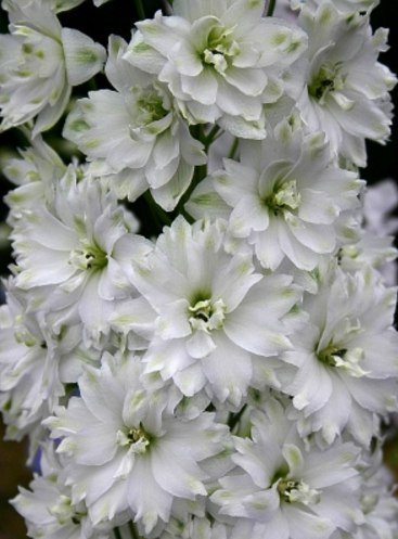 Дельфиниум Double Innocence обладает высочайшими декоративными качествами. Высота растения - 100-120 см. Цветение длительное - июнь-июль, повторное - в сентябре. Лепестки крупные, махровые (4-6 рядов). Соцветия собраны в плотные кисти до 60 см. Цвет нежно белый. Сорт зимостойкий, долговечный.