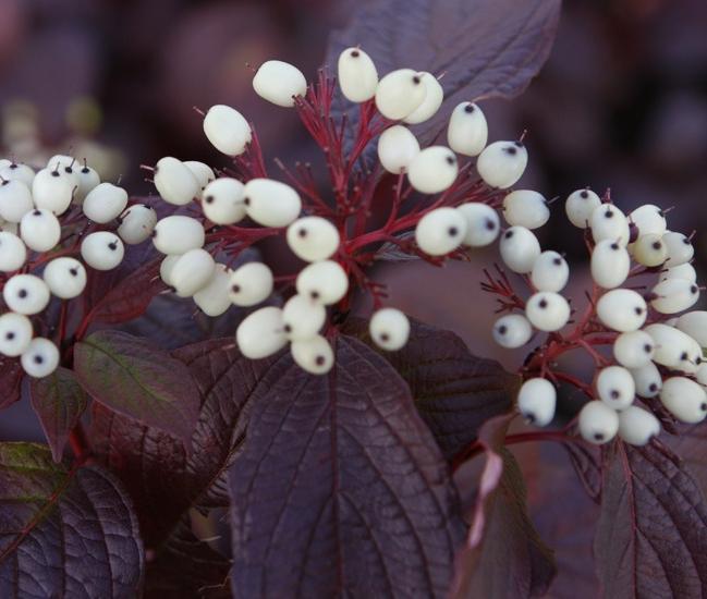 Кустарник с прямыми вертикально растущими побегами, вырастающий до 2 м в высоту. Прирастает ежегодно около 20 см в год. Листья темно –зеленые, дают прекрасный контраст с серебристо – белыми многочисленными плодами. Листья получают осенью ярко – красную окраску. Хорошо растет на любой почве, если достаточно влажна. Рекомедуется для городских озеленений и для больших садов