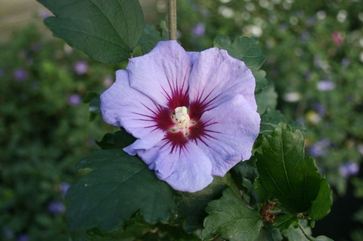 Гибискус Coelestis - узко-и пряморастущий кустарник с короткими побегами, цветки одиночные, фиолетово-голубые.