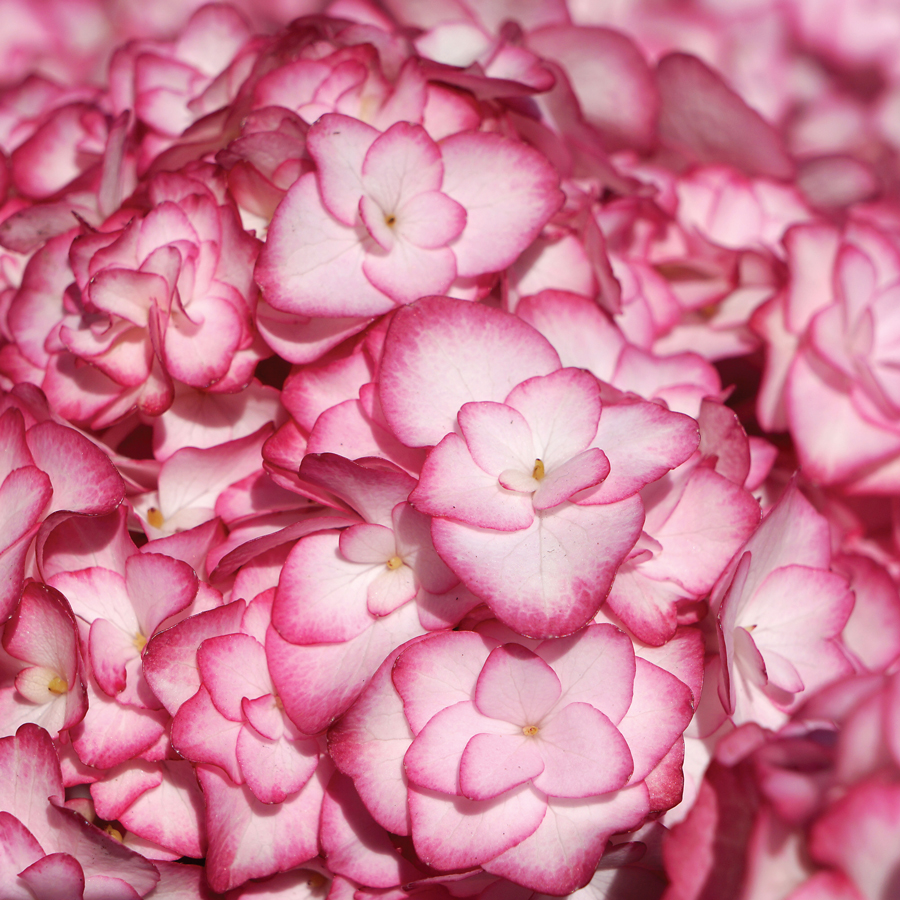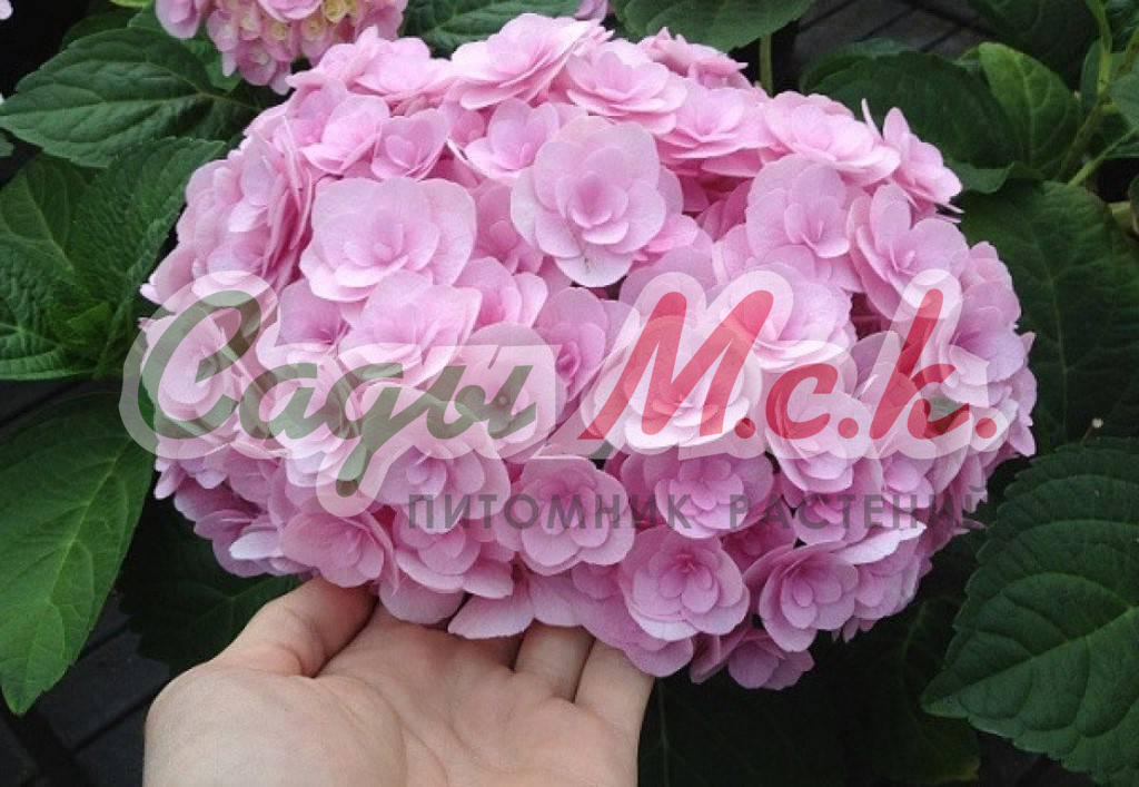 "Miss Saori" один из самых полюбившихся сортов гортензии из серии Ю Энд Ми, который представляет собой пышный, лиственный куст высотой до 1м., способный цвести на побегах текущего года имеет шаровидную форму кроны и махровые нежно-розовые с лиловой каймой цветы, собранные в роскошные шапки до 20см в диаметре, на фоне зеленых с фиолетовым отливом листьев.