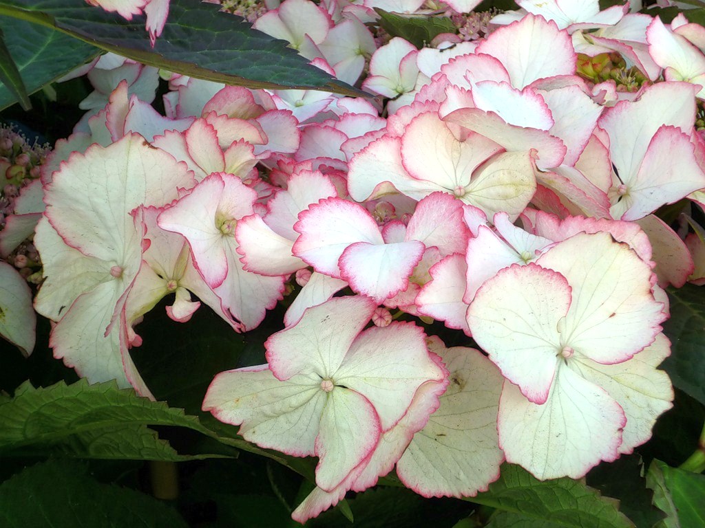 Гортензия крупнолистная Love You Kiss - бело-розовые цветки с красной каймой. Цветет обильно, непрерывно и длительно. Куст высотой около 1,5 м. Листья темно-зеленые, серцевидные, с зубчатым краем.