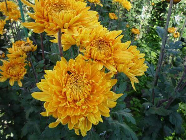 Хризантема корейская Янтарный бриз- куст плотный, компактный, около 50 см высотой, даёт корневую поросль. Корзинки махровые, ярко-жёлтого цвета, около 7,5 см в диаметре.