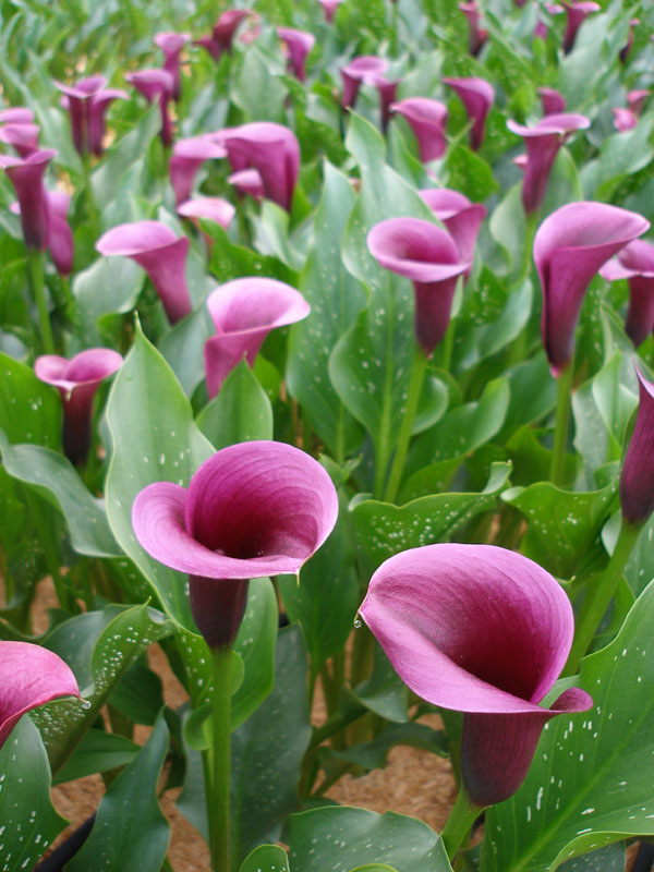 Калла Пинк Джевел - изящный цветок с покрывалом ярко-розового цвета, к краям более интенсивного. Листья темно-зеленые, плотные, будто восковые. Стебли крепкие, стройные. Цветет в июле-августа. Высота взрослого растения до 50 — 60 см