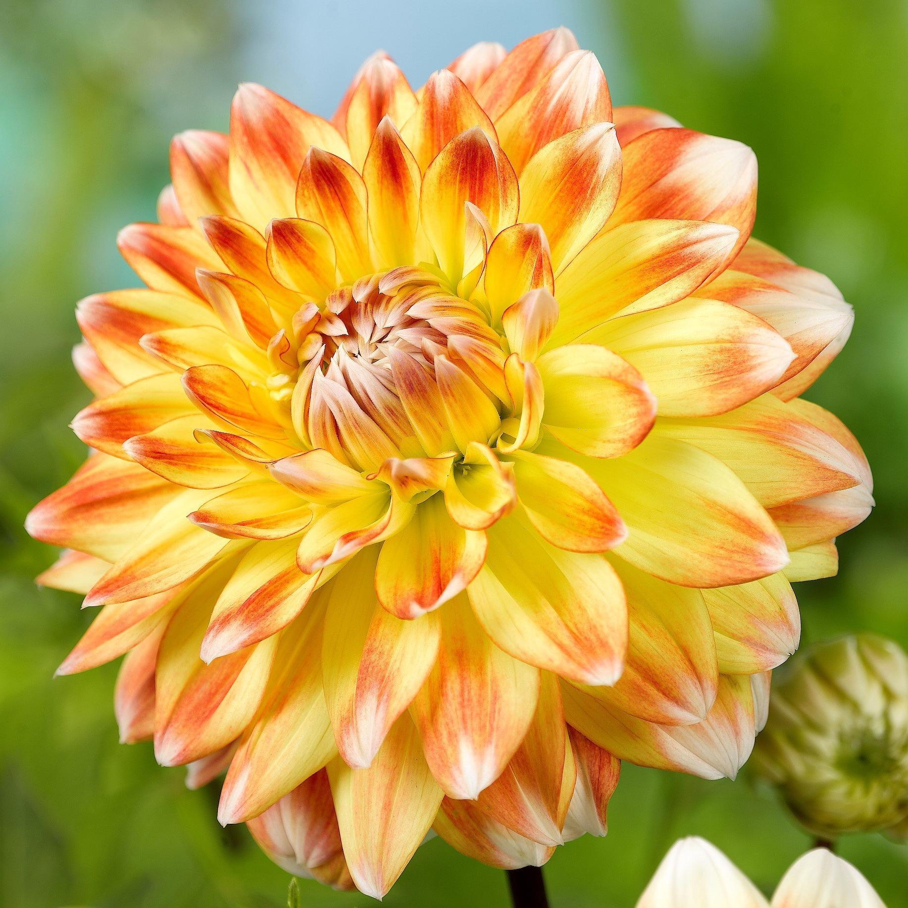 Георгина декоративная Пичиз энд Крим (Dahlia cultorum) относится к высокорослым растениям. Георгину часто высаживают для формирования ландшафтного дизайна, ей декорируют клумбы. Сорт отличается обильным цветением. Желто-оранжевая шапка георгины выглядит очень привлекательно на фоне других растений. Пичес & Крим имеет махровые лепестки.