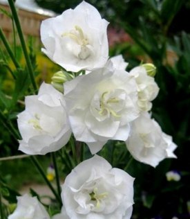 Колокольчик Plena alba - высокое многолетнее травянистое растение. Высота куста достигает 60 см. Цветет махровыми снежно-белыми цветками, которые обладают приятным легким ароматом. Побеги длинные, листья зеленые. Сорт зимостойкий, предпочитает солнце и полутень, цветет в июне-июле.