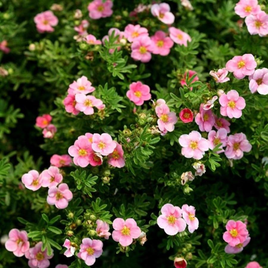 Корни лапчатки Princess по мере роста превращаются в обильно ветвящийся выносливый крупный куст, вырастающий до 1,5 метров в высоту. Светло–зеленая листва саженца летом набирает серебристый оттенок.