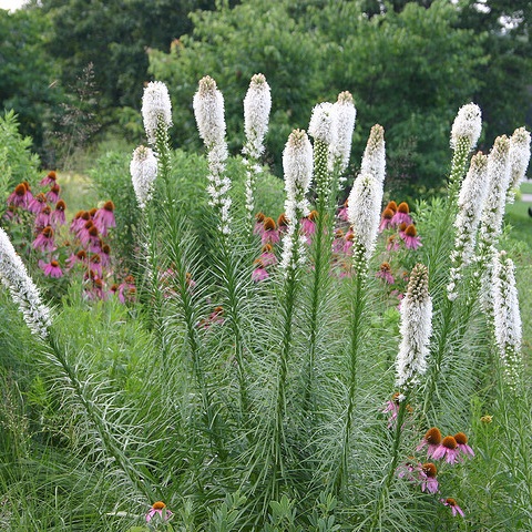 Лиатрис Alba - многолетнее растение с толстым стеблем и обилием цветов на его верхушке в период цветения. Цветы белого окраса, маленьких размеров. Очень плотно располагаются друг к другу. Листья узкие и длинные. Период цветения - июнь - август.