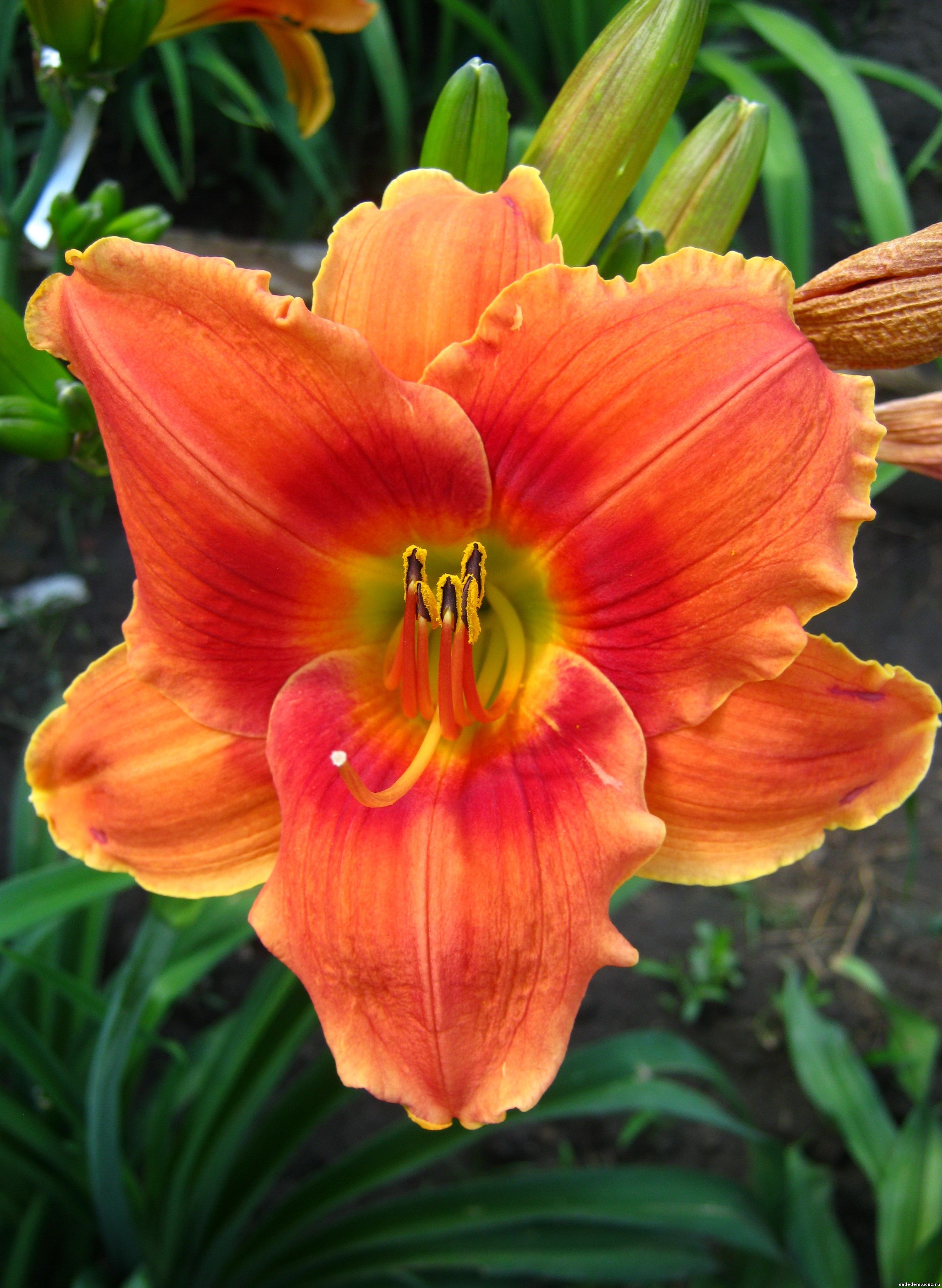 Саженцы лилейника Avante Garde весьма неприхотливы, хорошо переносят тень. Это одно из самых ярких достоинств растения. В высоту куст достигает 66 см, диаметр цветка составляет 14 см. Крупномер Avante Garde славится своими необычными цветками, которые имеют ярко оранжевую расцветку со светло-красной широкой каймой внутри. Саженцы на зиму не обязательно подрезать, достаточно подсыпать под основание торфокомпоста. По типу размножения – диплоид, хорошо переносит зимние условия. Прекрасно растет, цветение начинается в середине июля и продолжается 20-30 дней.