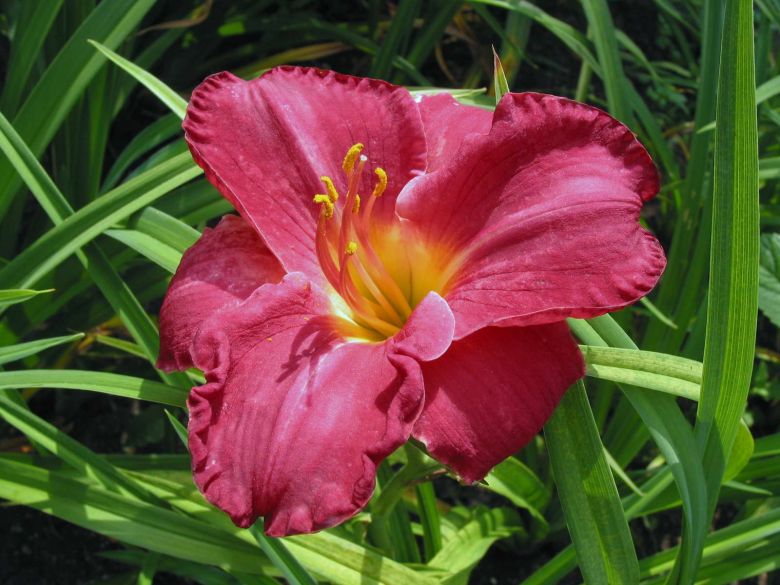 Саженцы гибридного лилейника Charles Johnston – многолетние растения с крупными цветами. Их диаметр – 15 см. Вишнёвые гофрированные лепесточки с розовыми прожилками и желтой серединкой. С конца июля начинается обильное цветение и повторяется по несколько раз. Высота растения чуть больше полуметра, 60 см. Крупномер Charles Johnston используется как в срезке, так и в озеленении газона, клумб, цветников и много другого.