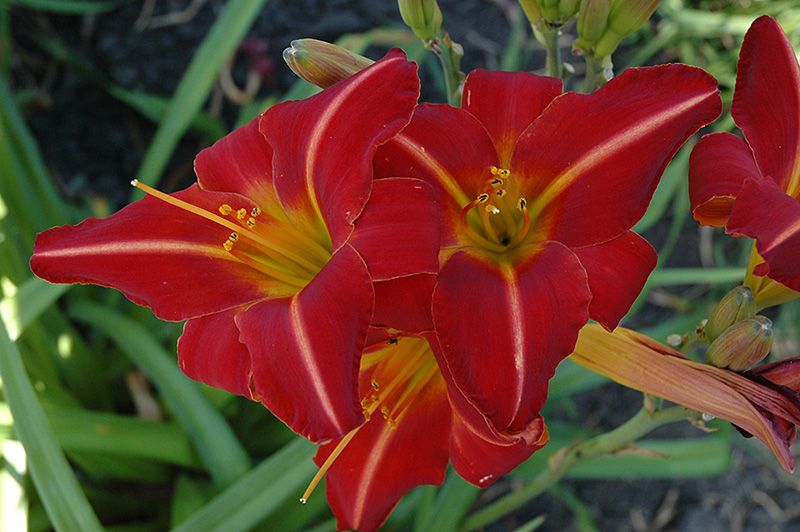 Саженцы лилейника Chicago Fire - это одни из немногих растений, которые устойчивы к заболеваниям и плохим погодным условиям. Травянистые листья этого лилейника остаются зелеными на протяжении всего сезона цветения. Растение высокое от 70 до 75 см, диаметр самого цветка от 13 до 15см. Цветок - воронкообразный теплого ярко - красного оттенка, горло желто - оранжевого цвета, а посередине внутренних лепестков полоски желтого цвета, доходящие только до половины. На одном цветоносе крупномера Chicago Fire может образоваться от 3 до 7 бутонов, которые собраны в раскидистые соцветия. Цвести начинает в середине сезона, то есть в начале августа и до начала октября.