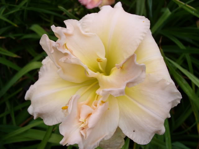 Саженцы лилейника Peggy Jeffсoat радуют владельца сада очень крупными цветками. Их диаметр 17 см. Махровые нежно кремовые лепесточки с розовыми полосками с жёлто - салатовым горлом. При повторном цветении крупномеры Peggy Jeffсoat могут поменять цвет на белый и стать более компактными. Высота стеблей не большая, 45 см. Бордюрные растения. Цветение среднепозднее, июль – август месяцы. Условия высаживания и ухода: при выборе места предпочтение даётся свету, а не тени; высаживать во влажный грунт, с перегноем; устойчив к непогоде;не боится засухи, его довольно мощные корни достают влагу с глубины земли.