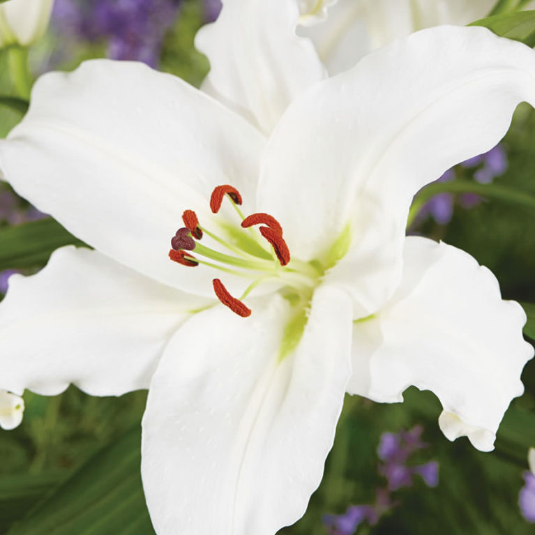Луковицы лилии восточной Астериан (Lilium oriental hybrids Asterian) — это лучший вариант для выращивания под срез. На одном стебле одновременно распускается несколько цветов, по 15 см в диаметре. Они окрашены в классический белый цвет с яркими оранжевыми пыльниками. Лепестки очень долго не осыпаются, поэтому букеты отлично переносят хранение и транспортировку. Выращивать лилию Астериан можно в теплице или в открытом грунте. Цветам не страшны заморозки (под укрытием) и прямые солнечные лучи. Если выбрать подходящее место под посадку и периодически вносить минеральные удобрения, Лилия восточная Астериан может оставаться на одном месте до 5 лет без пересадки и ежегодно цвести.