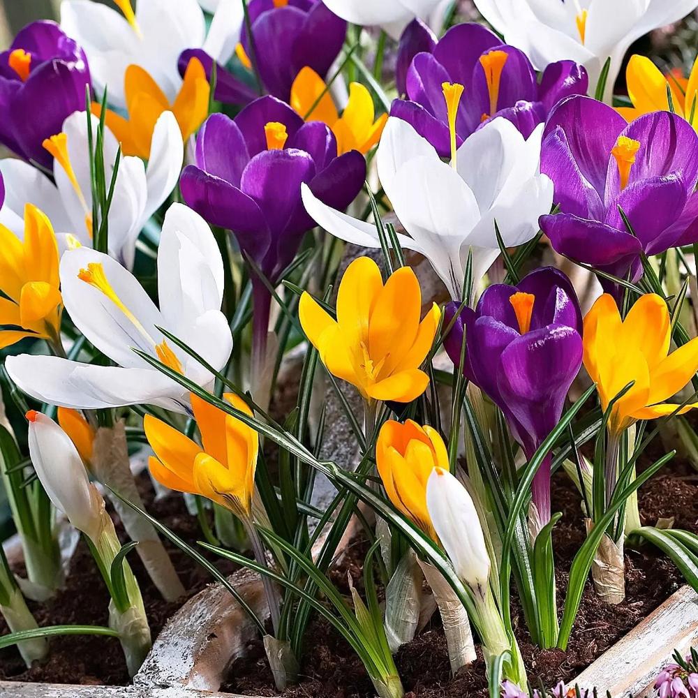 Крокус смесь окрасок (смесь сортов) одними из первых растений на участке порадуют ярким цветением. Крокусы очень популярны в частном цветоводстве, поэтому селекционеры не перестают радовать их поклонников новыми сортами. Благодаря их усилиям, бокаловидные цветки у этих крокусов почти в два раза больше, чем у их дикорастущих разновидностей. Крупноцветковые крокусы, которые входят в смесь «Весенняя палитра», отличаются длительным цветением. В составе Крокусов смесь окрасок самые яркие и популярные оттенки ― белый, голубой, фиолетовый.
