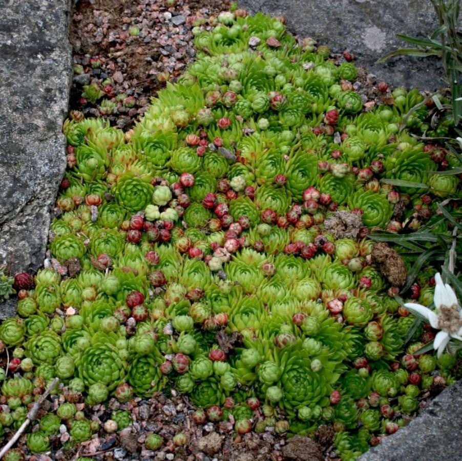 Молодило Haide - карликовая разновидность паутинчатого молодила. Все розочки практически одного размера, создают впечатление плюшевых кочек. Окрас этого растения зеленый.