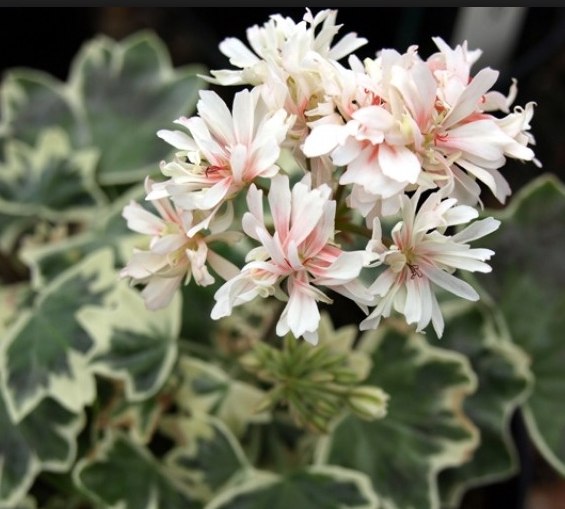 Пеларгония Silver Snow - карликовый кустарник. Листья очень большие, по краям дольчатые, темно-зеленые с кремово-белыми краями. Цветки маленькие, махровые. Лепестки тонкие и длинные, белого окраса с розовыми оттенками из основания. Цветки состоят в небольших соцветиях.