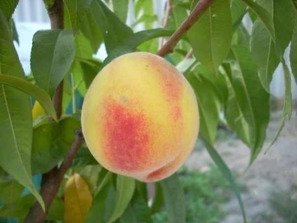 Персик Greensboro - дерево крупное, с раскидистой кроной. Листья средних размеров (12—-16 см длины), часто лодочкообразно сложенные по центральной жилке, с загнутыми вниз концами, толстые, кожистые. Цветки крупные, на очень короткой цветоножке, с бледно-розовыми, выше средних размеров, лепестками, широко-овальной, почти округлой формы. Плоды крупные, овальные с округлой, слегка притуплённой вершиной и с блюдцевидной ямкой на ней до 5—8 мм глубины. Основание притуплённое с ямкой до 15 мм глубины и 20—25 мм ширины. Основная окраска плодов зеленовато-кремовая с румянцем в виде штрихов и точек ярко-малинового.