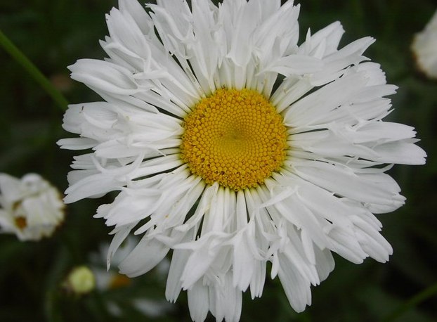 Ромашка Aglaia - многолетнее травянистое растение до 80 см высоты. Корзинки около 10 см диаметром, полумахровые, одиночные, верхушечные. Краевые язычковые цветки одно-двухрядные, белые, один или несколько рядов краевых трубчатых цветков значительно увеличены, равны или почти равны по длине язычковым цветкам, также окрашены в белый цвет. Центральный диск относительно мелкий, густо-желтый.