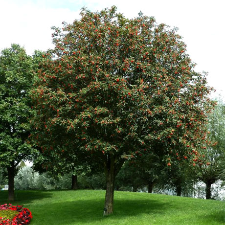Рябина Brouwers - интереснейший сорт, который довольно-таки легко выращивать. Высота — до 9-12 м, прирост — до 40 см в год, Форма кроны — узко-конусовидная, со временем становится яйцевидной. Диаметр не более девяти метров. Крупные листья — цельные, яйцевидные. Их верхняя часть темного зеленого цвета, нижняя — чуть сероватая из-за «опушки». В осенний период листья меняют цвет и становятся красными. Довольно большие (приятного белого цвета) цветки составляют широкие щитки. Обычно дерево усыпано ими в период цветения, который начинается в конце мая. Сантиметровые плоды зреют в сентябре, демонстрируя оранжево-красную окраску.