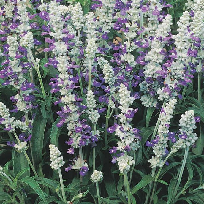 Многолетнее растение, выращиваемое как однолетнее. Растение компактное, хорошо разветвленное, высотой 30-40 см. Бело-голубые цветки собраны в плотные кистевидные соцветия, достигающие 10 см длиной. Отличается ранним и обильным цветением, которое продолжается до первых заморозков. Сальвию широко используют для оформления парадных цветников, рабаток, а также создания ярких групп на фоне газона.. Агротехника: Сальвия - тепло- и влаголюбивая культура, плохо переносят заморозки. Семена высевают на рассаду с середины марта до середины апреля. Всходы появляются на 9-10 день после посева семян. Рассаду высаживают в грунт в мае-июне, когда минует угроза заморозков по схеме 20 на 30 см. Цветение начинается через 70-100 дней после появления всходов и продолжается до заморозков.