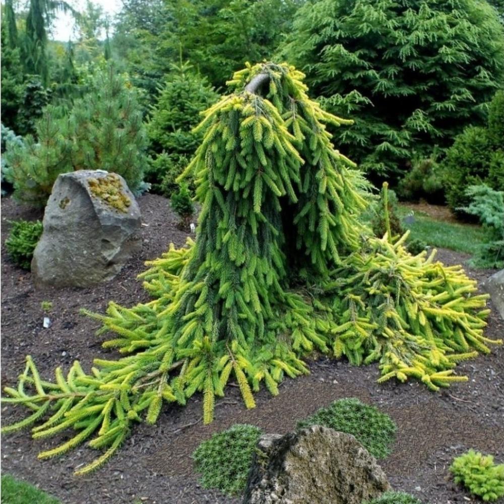 Золотая ель плакучей формы, годовой прирост около 15-20 см. К десяти годам высота составляет 150-180 см. Молодая хвоя ярко-зеленого цвета, затем желтого. Молодому растению необходимо ставить опору, или выращивать как почвопокровное растение. Морозостойкость -40С.
