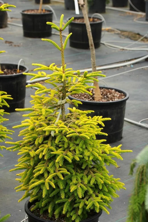 Ель восточная Skylands - дерево с пирамидальной кроной и короткой плотной хвоей, которая круглый год красуется золотистой окраской. Достигает 11 м в высоту и 2 м в ширину, но растет медленно - не более 8-15 см в год, а в молодом возрасте еще медленнее (в 10 лет может иметь высоту 1,6 м). Одна из самых популярных разновидностей ели.