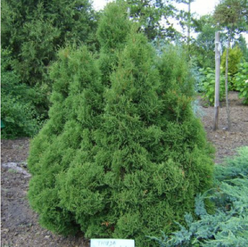 Туя западная Dumosa - карликовый кустарник до 1 м высоты и такого же диаметра. Крона плоско-шаровидная, несколько неправильная. Ветвление своеобразное, веточки многочисленные, тонкие, частично более или менее скрученные или изогнутые, частично горизонтальные, прямые, а на верхушке преимущественно ветвящиеся в вертикальной плоскости. Хвоя зеленая, густая.