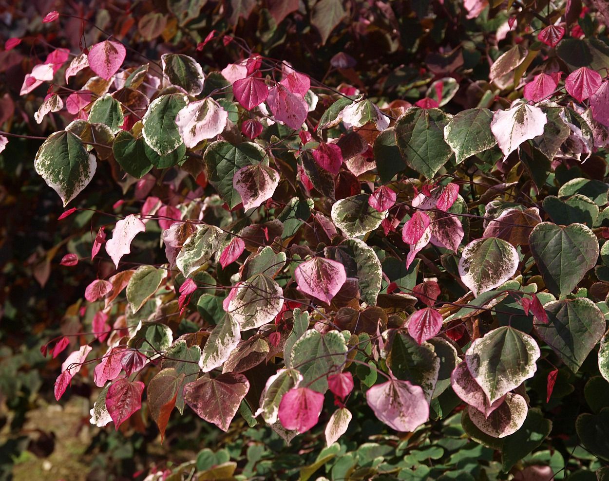 Небольшое дерево высотой до 3–4 м с декоративной, красочной пестрой листвой. Крона раскидистая, рыхлая. Листовые пластинки крупные, сердцевидные, разных оттенков белого, розового, фиолетового и зеленого цветов, на длинных розово-фиолетовых черенках. Эти оттенки отчетливо выражены прежде всего на молодых листьях, также в форме частично накладывающихся друг на друга полосок, точек и пятен. Поздним летом листья зеленеют. Розовые цветки распускаются вместе с листьями в конце апреля – начале мая. Они собраны в пучки, состоящие из нескольких штук. Цветки образуются непосредственно на стволах и сучьях, а также на молодых ветвях. Растение требует теплого и защищенного от ветра местоположения, предпочитает места солнечные или полутень. Почва должна быть нейтральной или щелочной, умеренно влажной и средне богатой микро- и макроэлементами. Морозостойкий сорт (зона 5b). Оригинальное дерево, рекомендуемое для посадки в малых придомовых садах, на видных местах, для украшения зеленых участков внутри жилых микрорайонов, а также в композициях с растениями с темной листвой