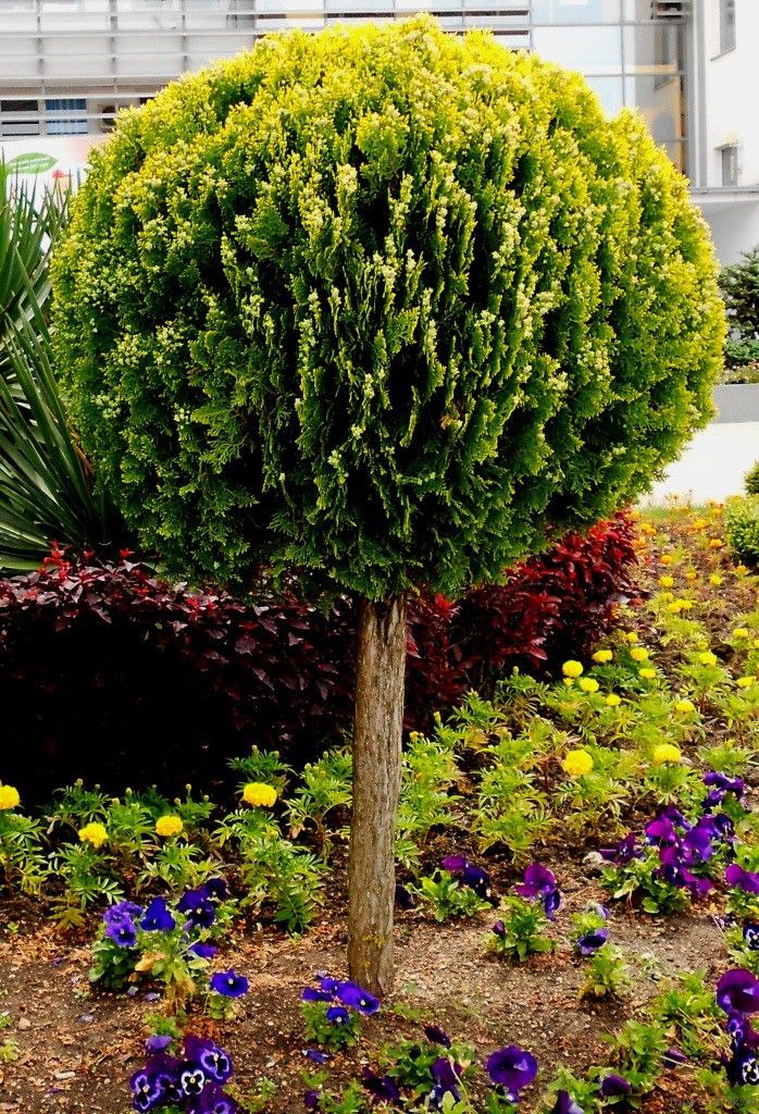 Хвойный кустарник с пирамидальной раскидистой кроной привитый на штамб.Высотой 3 м в 10 лет.+ высота штамба. Растет быстро. Старые растения имеют высоту до 6 м и диаметр кроны до 4,5 м. Хвоя чешуйчатая, тёмно-зелёная, а у молодых приростов золотисто-желтая. Летом в жаркую погоду кончики хвои становятся золотистыми.Теневынослива, нетребовательна к плодородию почвы, дымогазоустойчива. Чаще используется для одиночных посадок, аллей и групп.