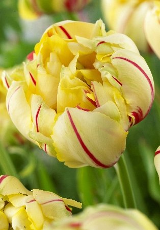 Тюльпан Glamour Unique - – это представитель класса махровых поздних тюльпанов. Его бутон обладает лимонно-желтой окраски с полосками красно-малинового цвета. Форма цветка пионовидная. Высота – 8-10 см, а диаметр в раскрытом виде – 12 сантиметров. Высота цветоноса взрослого растения – 40 см. Для посадки лучше выбрать конец сентября или первую половину октября. Глубина посадки – 10-20 см. Цветет сорт в мае в течение 10-15 дней. Этот тюльпан станет хорошим вариантом для украшения клумб и создания букетов